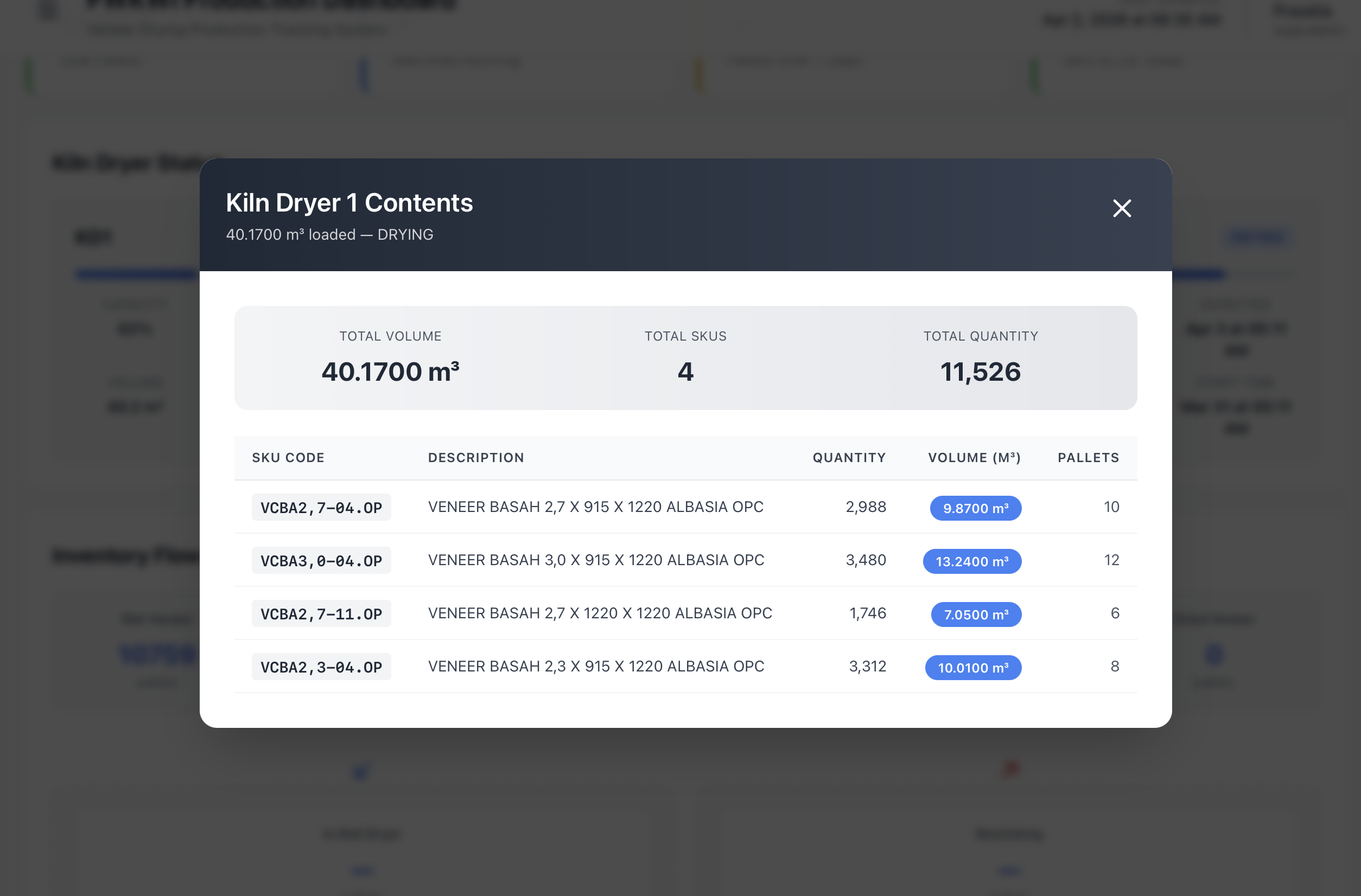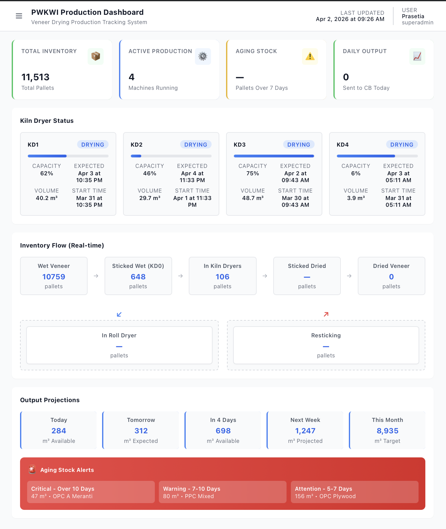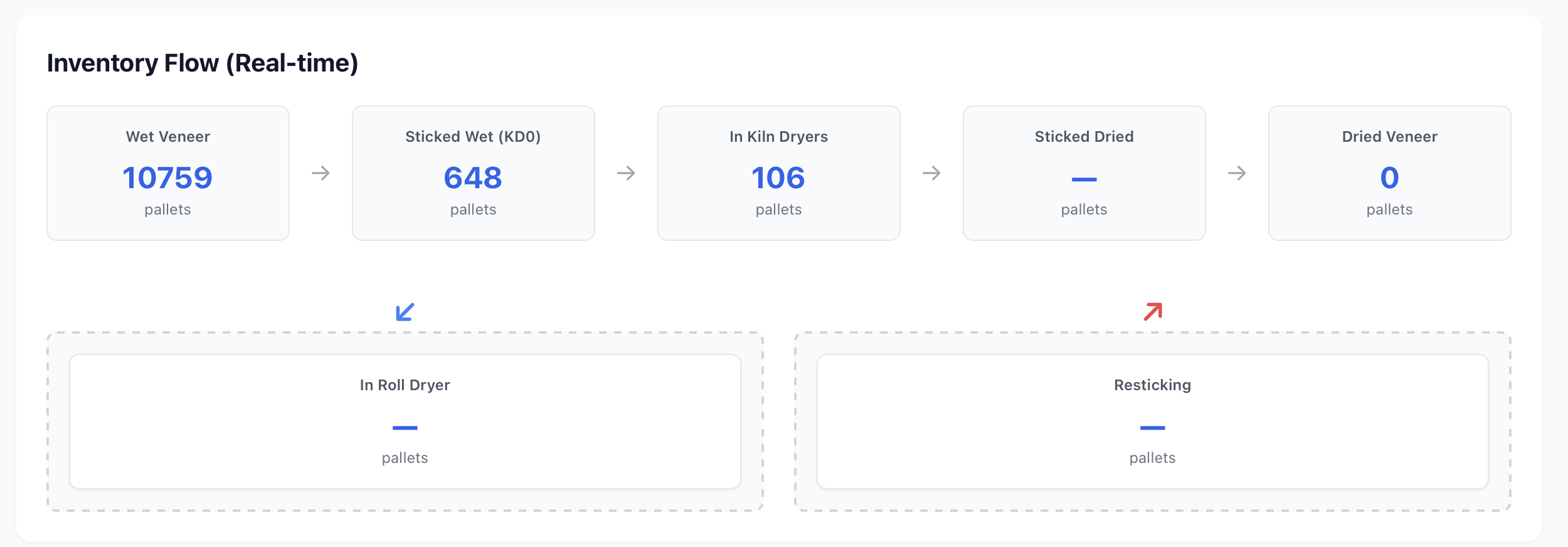 | Total Inventory | Jumlah total palet yang ada di seluruh tahap produksi (wet veneer, sticked, in kiln, dried veneer) |