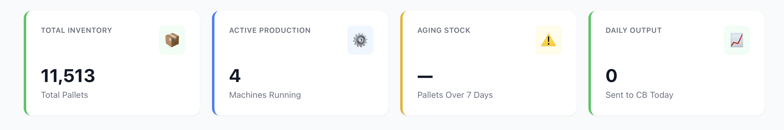 Bagian paling atas Dashboard menampilkan 4 kartu ringkasan yang memberikan gambaran cepat tentang kondisi produksi saat ini.
