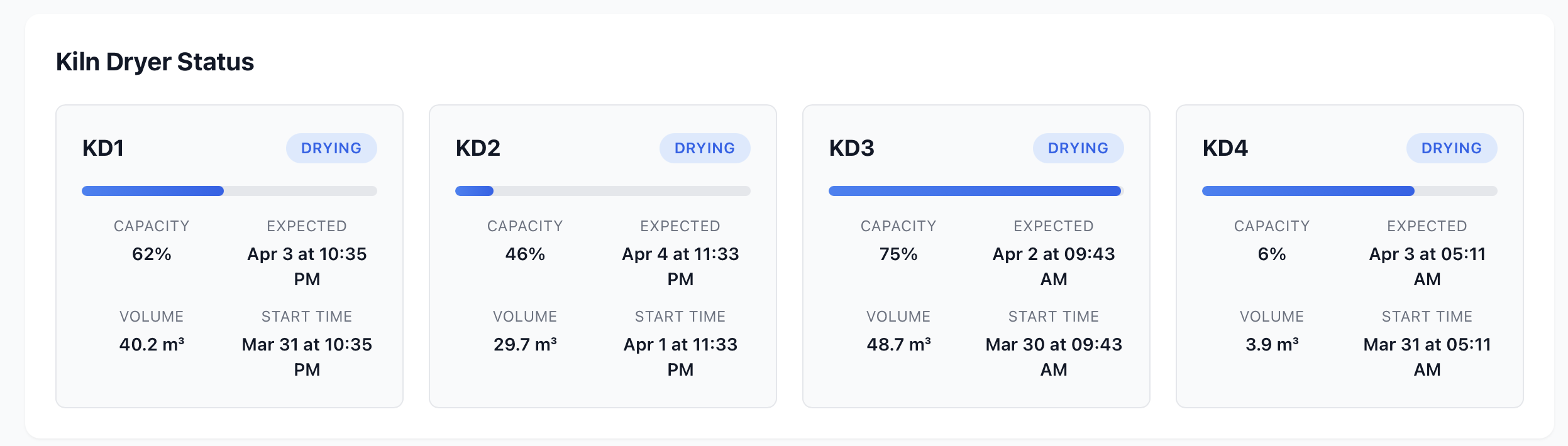 | Active Production | Jumlah mesin Kiln Dryer yang sedang aktif melakukan proses pengeringan |