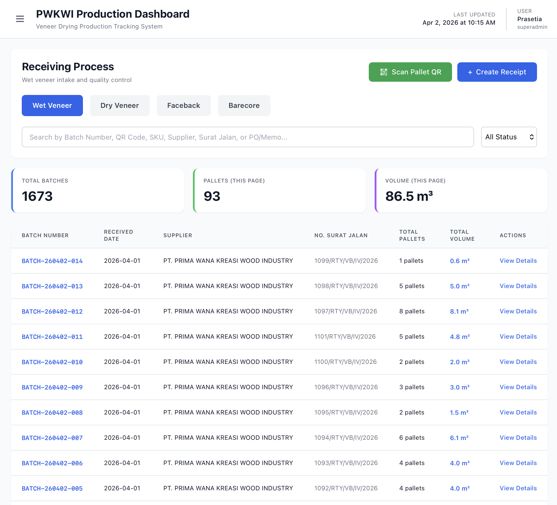 Setiap palet wet veneer yang baru diterima memiliki status "Awaiting QC" dan harus melewati proses pemeriksaan kualitas sebelum dapat diproses lebih lanjut.