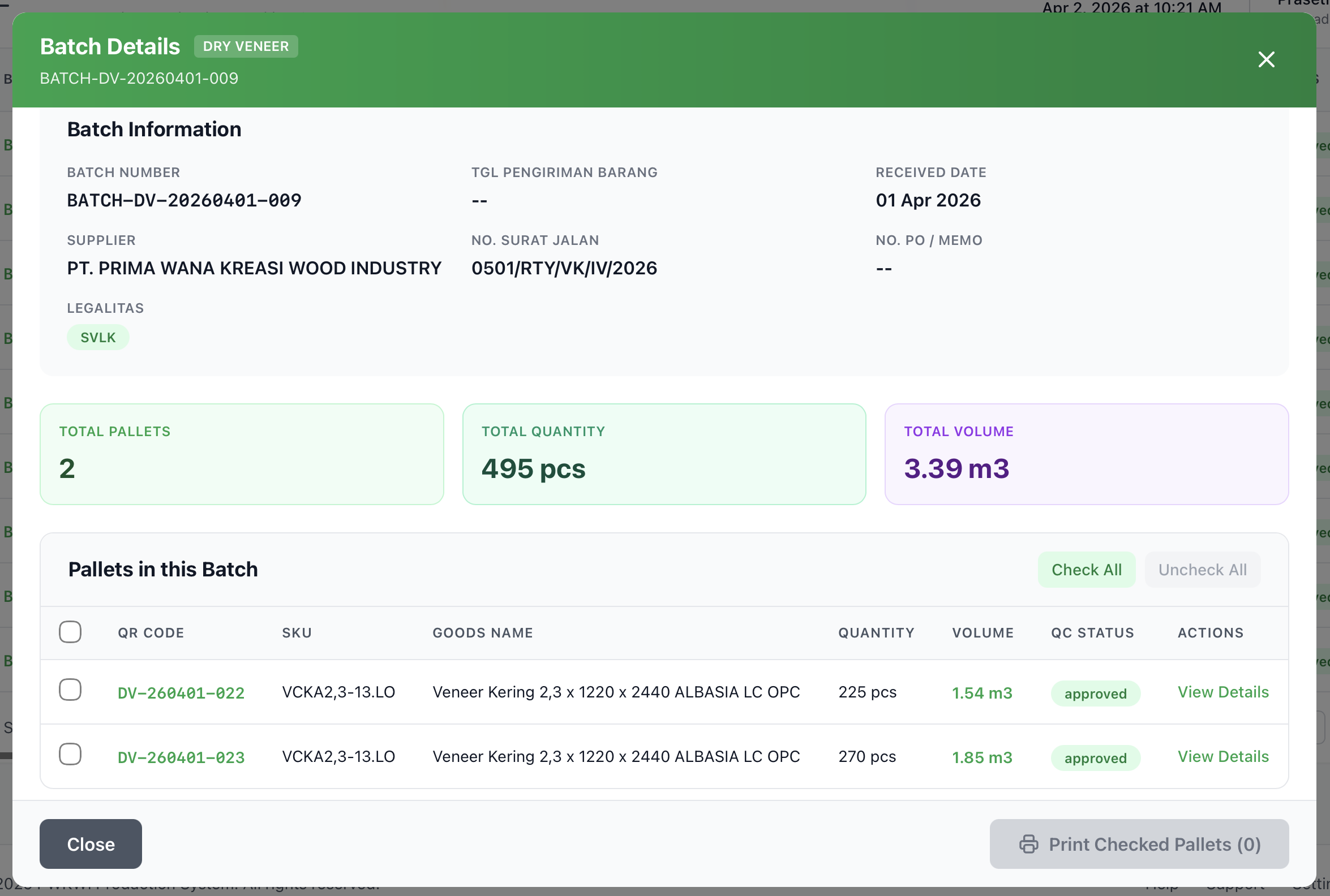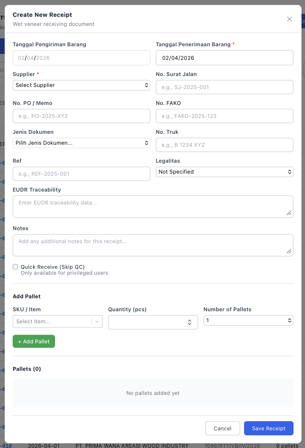 Perubahan SKU saat QC: Jika saat pemeriksaan kualitas ternyata jenis veneer berbeda dari yang dicatat, Anda dapat mengubah SKU saat konfirmasi QC. Sistem akan menghitung ulang volume berdasarkan dimensi SKU baru.