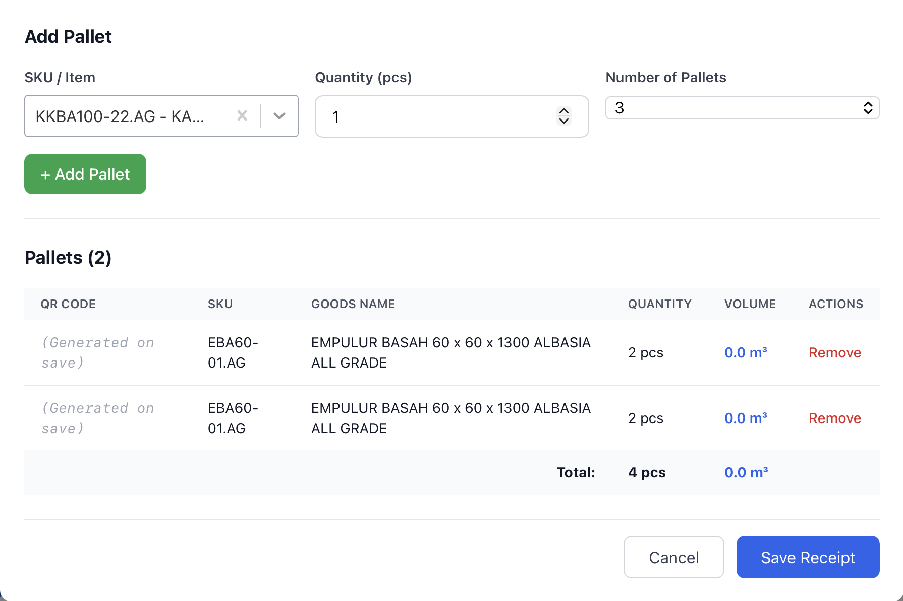 - Klik Save Receipt untuk membuat seluruh palet sekaligus.