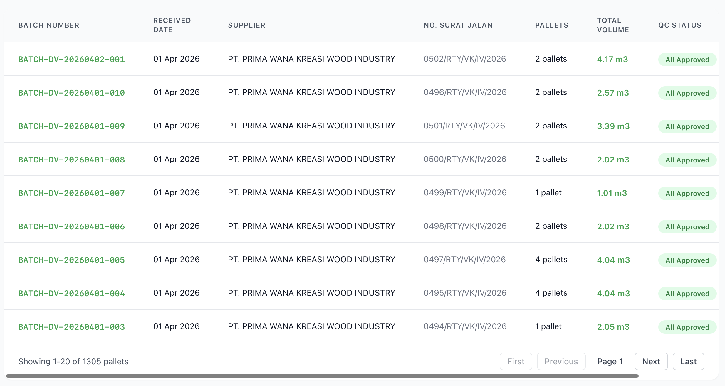 - Approve: Mengklik "Approve" pada satu palet akan otomatis menyetujui semua palet dalam batch yang sama dengan SKU dan status QC yang sama.