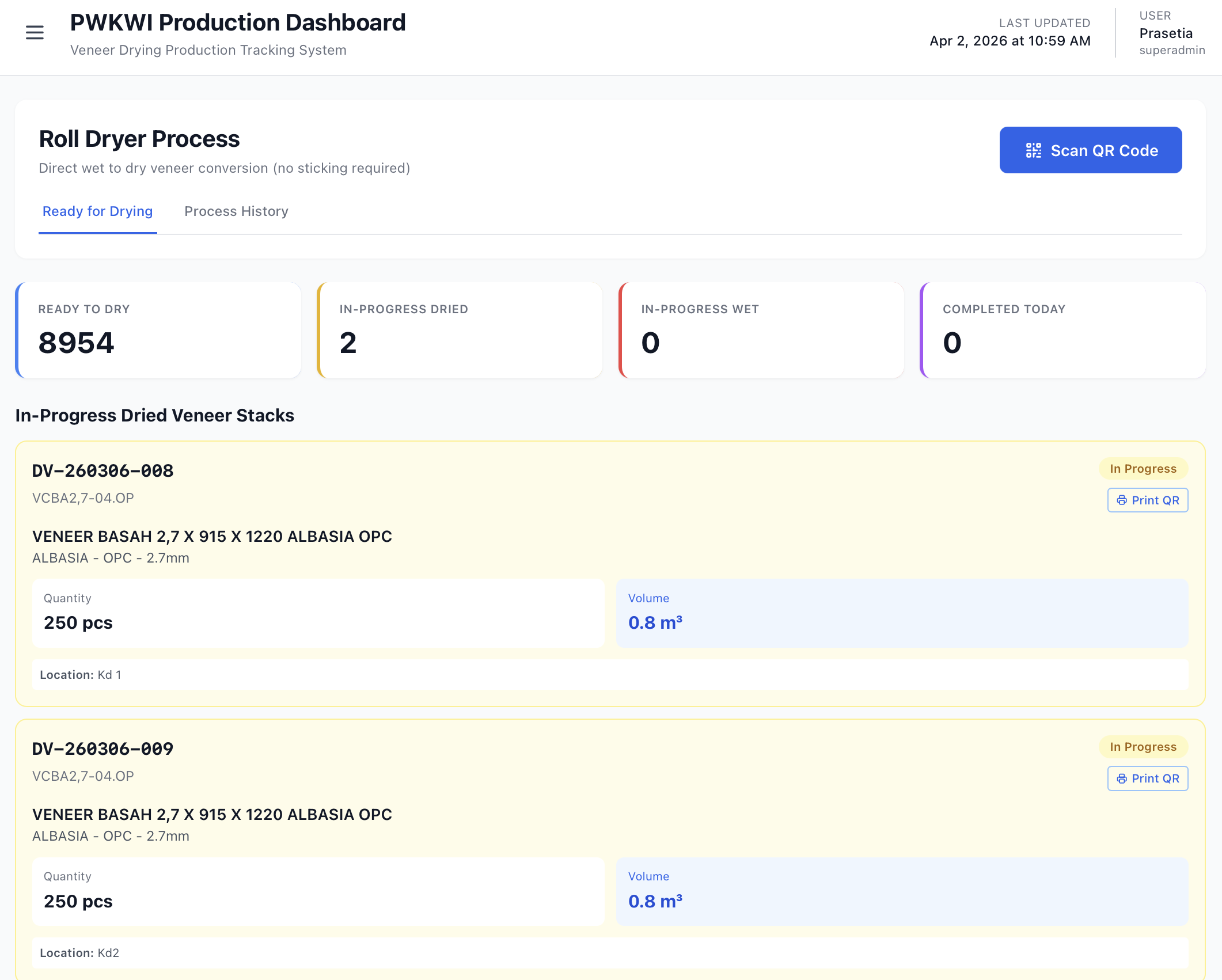 - New Stack — Membuat palet dried veneer baru (kode QR otomatis dengan prefix DV)