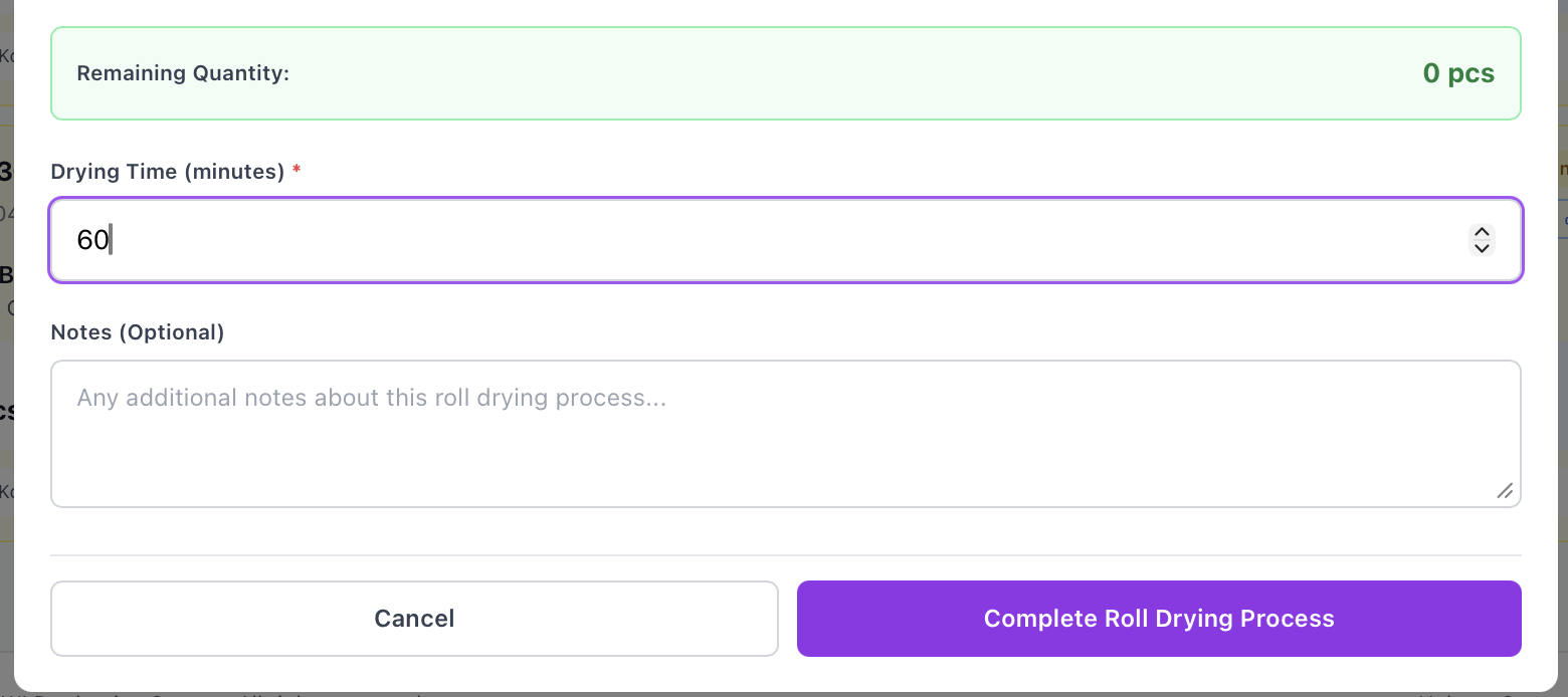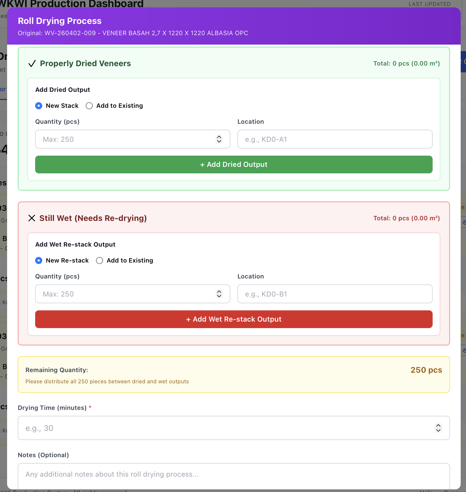 Total quantity output (dried + wet re-stack) harus sama persis dengan quantity palet sumber. Anda tidak dapat menyelesaikan proses jika masih ada sisa yang belum dialokasikan.