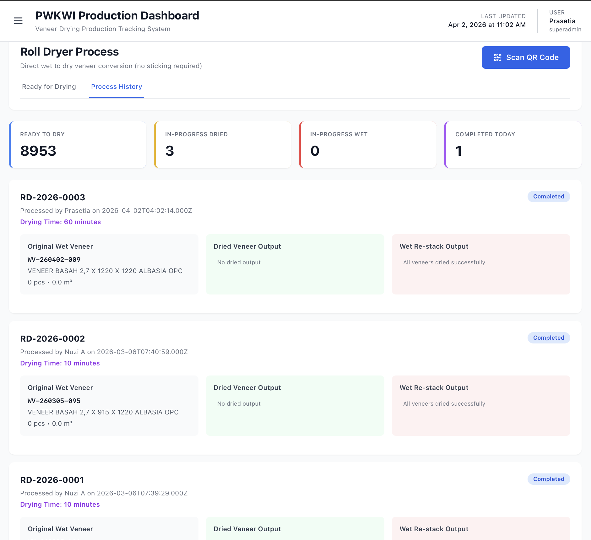 - Process History — Riwayat seluruh operasi roll drying yang sudah dilakukan